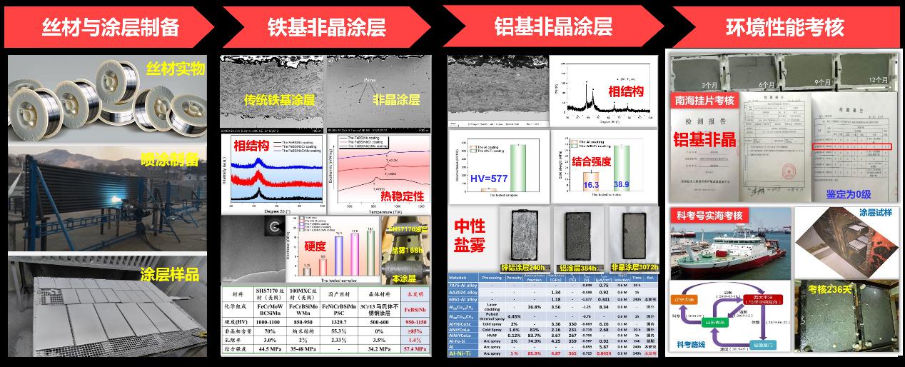 针对严苛服役环境下装备零部件失效与再制造难题,研发了强非晶形成能力的铁基和铝基粉芯丝材,基于高速电弧喷涂技术原位合成了铁基和铝基非晶/纳米涂层,具有低成本、低孔隙率、高非晶含量、高硬度和长效防腐性能,铝基非晶涂层中性盐雾3000 h,南海挂片和实海考核均无锈蚀。