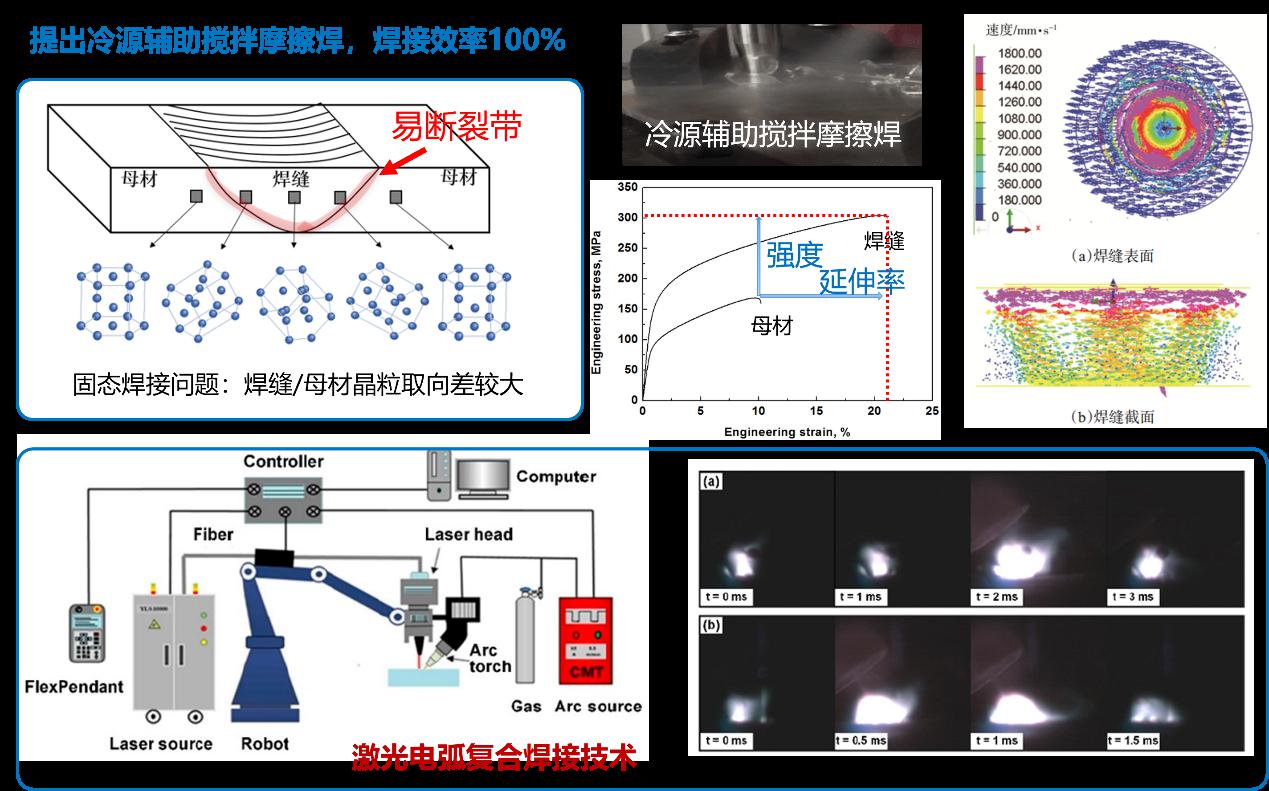 针对镁合金焊接效率不足的问题,提出冷源辅助搅拌摩擦焊接工艺及理论,成功实现镁合金等强焊接,焊接效率达100%,并揭示了焊接温度场和材料流动对焊缝微观组织的影响规律;利用激光电弧复合焊接技术实现了管线钢和镁合金高速高质量焊接,焊接过程可控、变形量小、适用于复杂结构件。