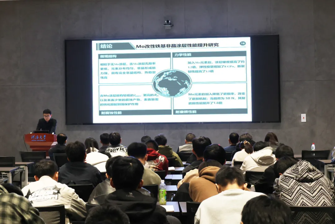 24级博士研究生宋培松以“Mo改性铁基非晶涂层性能提升研究”为题,通过金属相结构和热稳定性、涂层的力学性能、涂层在中性环境中的耐腐蚀性能等角度为大家展示了他的研究成果,详细介绍了高性能、长寿命、经济化一体的新型耐腐蚀材料。