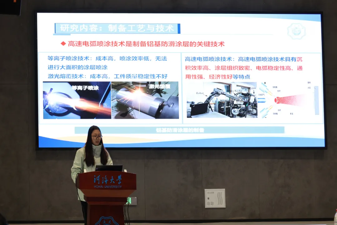 23级硕士研究生许潇,以“高速电弧喷涂不同结构铝基复合涂层组织及腐蚀与摩擦磨损行为研究”为主题,介绍了涂层保护目前的优缺点,同时介绍了激光熔覆技术与其他技术相比的明显优势。分享了铝基复合涂层腐蚀与磨损行为的实验探求路线,展示了目前的研究工作与成果,为大家在腐蚀保护方向提供了新见解。