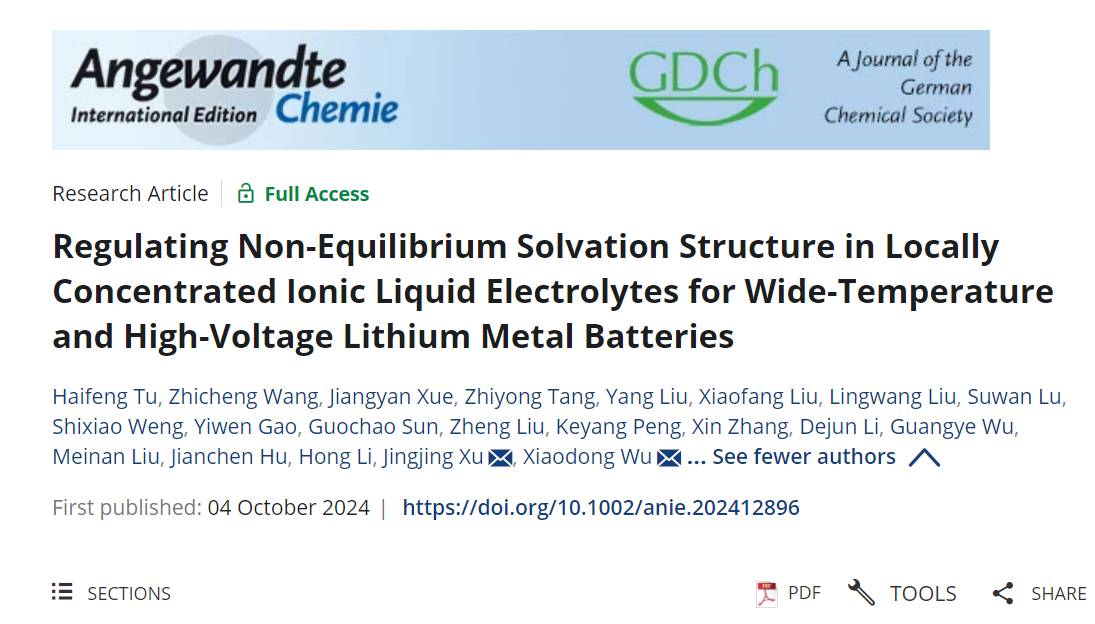 许晶晶研究员以共同通讯作者身份在国际知名期刊《Angwandte Chemie International Edition》(德国应用化学)上发表了题为“Regulating Non-Equilibrium Solvation Structure in Locally Concentrated Ionic Liquid Electrolytes for Wide-Temperature and High-Voltage Lithium Metal Batteries”的研究性论文。中国科学院苏州纳米技术与纳米仿生研究所吴晓东研究员为论文共同通讯作者。