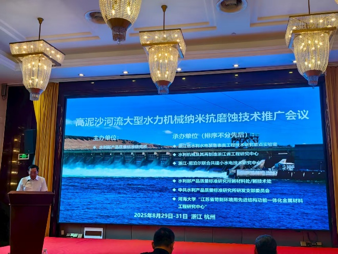 2025年8月29日- 30日,由水利部产品质量标准研究所主办的“高泥沙河流大型水力机械纳米抗磨蚀技术推广会议”在浙江杭州举行,91直播 “江苏省苛刻环境用先进结构功能一体化金属材料工程研究中心”与浙江省水利水电装备表面工程技术研究重点实验室等多家单位联合承办。
