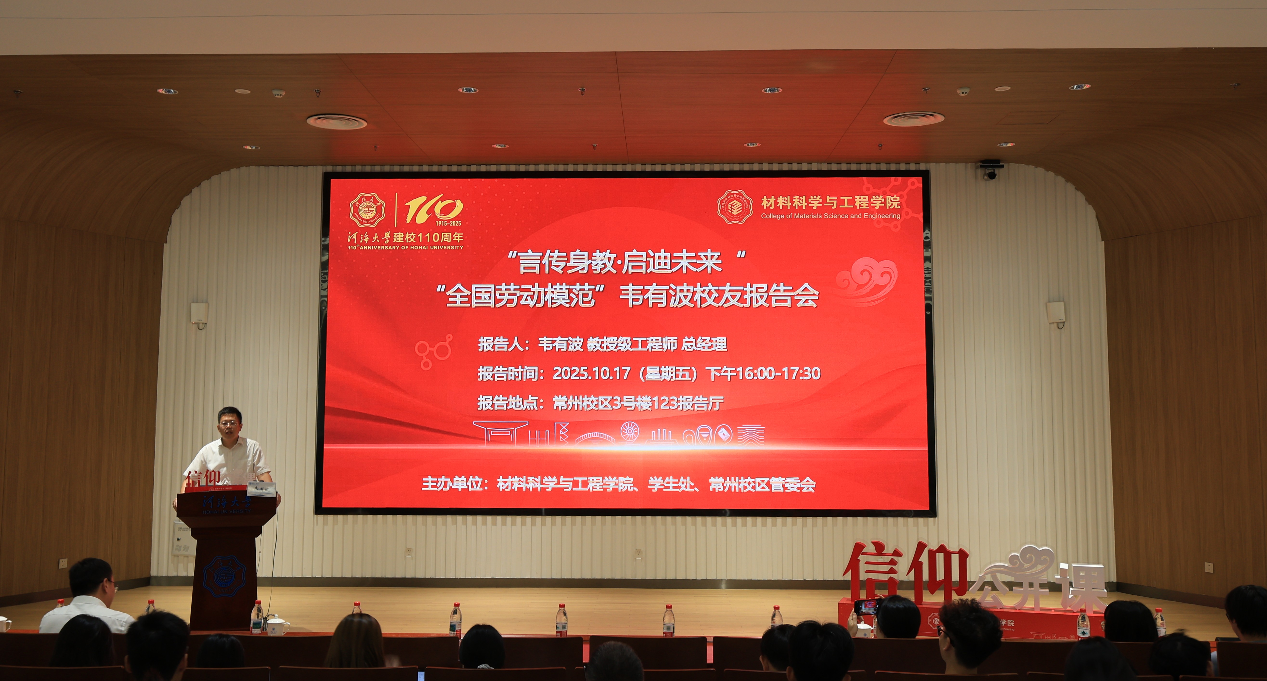 为使青年学子坚定将青春华章写在祖国大地上的选择,汲取校友榜样的奋斗力量,10月17日下午,91直播 与常州校区管委会联合举办“言传身教·启迪未来”——“全国劳动模范”韦有波校友报告会暨信仰公开课,2025年“全国劳动模范”称号获得者、我校2005届无机非金属材料工程专业校友韦有波应邀作题为《生成未来,做最好的自己》的分享报告。