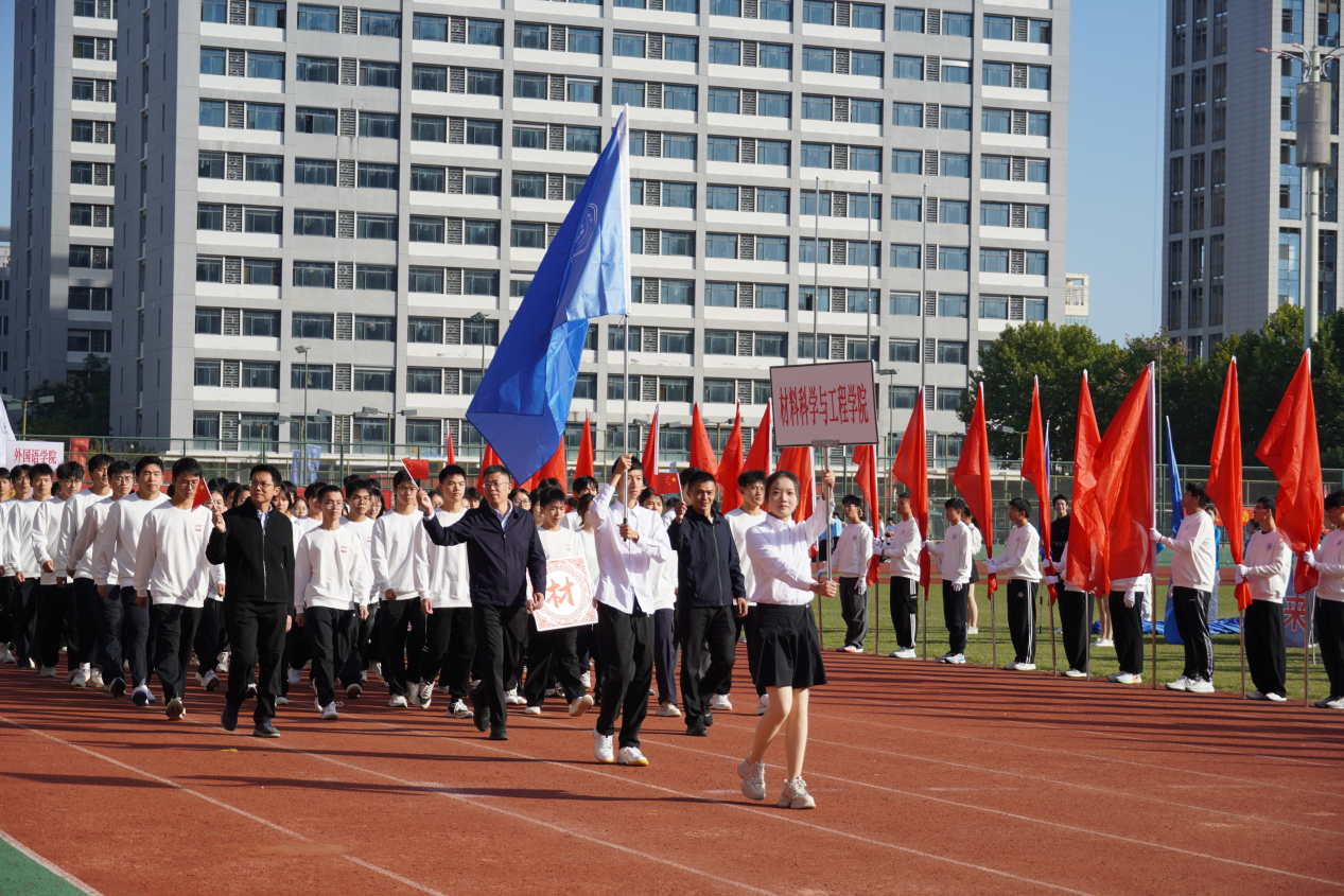 上午八点整,运动会开幕式在万众期待中正式开始。学院党委书记陈伟刚,副院长宋丹和党委副书记、副院长辛绍权带领学生方阵,迈着整齐划一的步伐走向主席台。91直播 学子们身着百十校庆特色文化衫,高高举起学院为河海110周年校庆精心设计的带有金坛刻纸元素的旗帜,步伐矫健,动作协调,配合“材心赋运动,百十竞巅峰”的嘹亮口号与精彩队列变换,彰显出学院学子团结进取的精神,并代表学院全体师生向学校送上百十祝福,赢得现场热烈掌声。